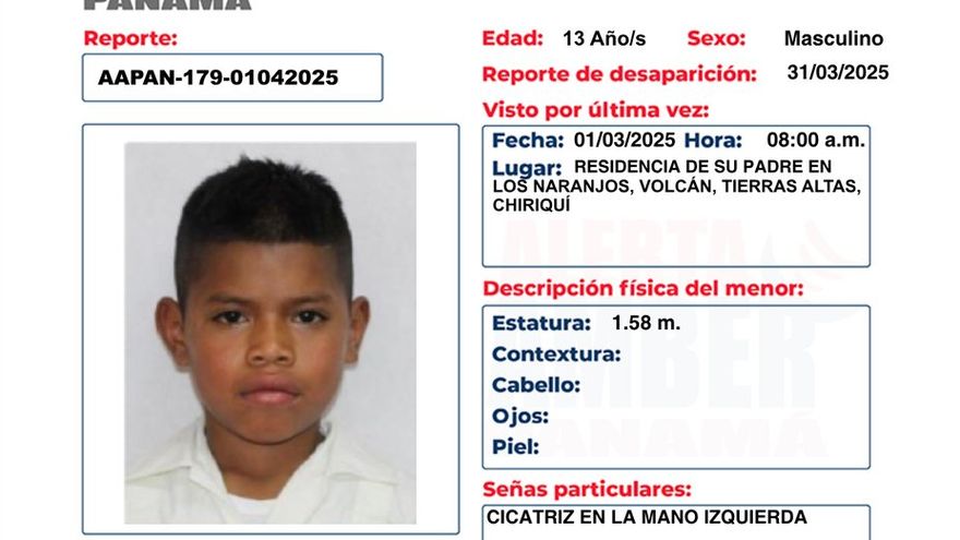 Se trata de Jonathan Santos Moreno de 13 años, quien fue visto por última vez el 1 de marzo a las 8:00 a.m., en la residencia de su padre ubicada en el área de Los Naranjos, en el corregimiento de Volcán, distrito de Tierras Altas, provincia de Chiriquí.