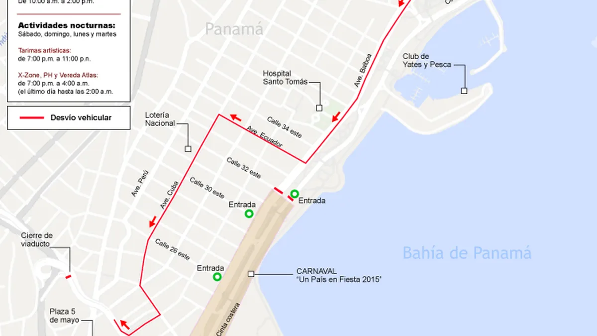 Según el Decreto Alcaldicio N°12-2015 del 6 de febrero de 2015, publicado en la Gaceta Oficial de este miércoles, 11 de febrero, las entradas al público en general, estarán ubicadas en calle 3 de noviembre, 26 Este y Calle 30 este, entrando por la Cinta Costera.