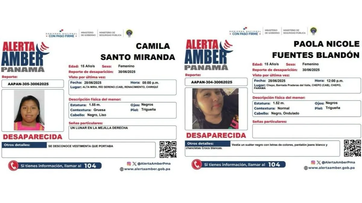 Ciudad de Panamá/El Ministerio Público y la Unidad de Personas Desaparecidas han activado doble alerta Amber para localizar a dos adolescentes desaparecidas, una en Chiriquí y la otra en Chepo.