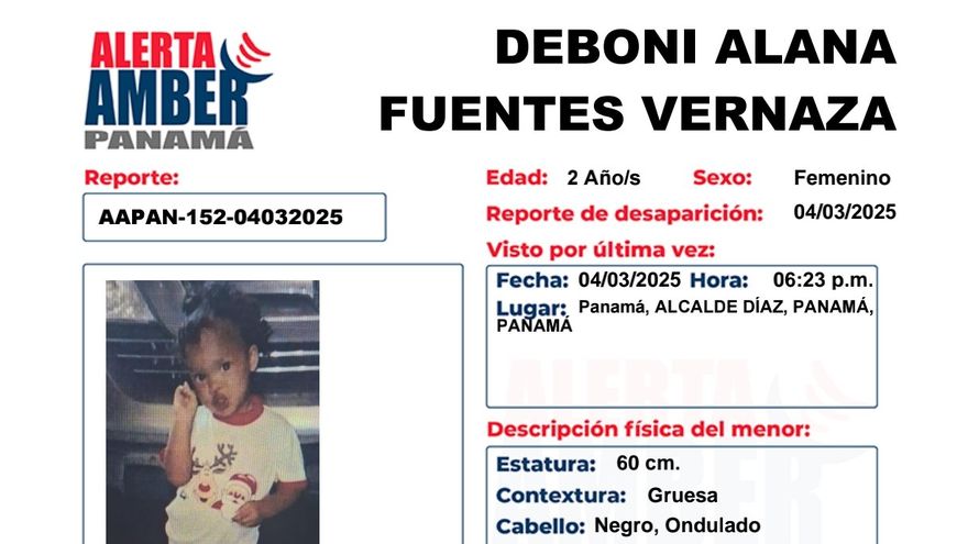 La tarde de este martes 4 de marzo, el Ministerio Público activó una nueva Alerta Amber para dar con el paradero de la niña Deboni Alana Fuentes Vernaza de 2 años quien desapareció en el corregimiento de Alcalde Díaz, en Panamá Norte.