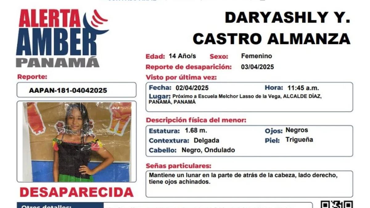 Ciudad de Panamá, Panamá/Las autoridades panameñas han activado la alerta Amber tras la desaparición de una adolescente en la provincia de Panamá, según informó el Ministerio Público. Se trata de Daryashly Castro Almanza, de 14 años, quien fue vista por última vez el 2 de abril a las 11:45 de la mañana próxima a la Escuela Melchor Lazo de la Vega, ubicada en Alcalde Díaz.