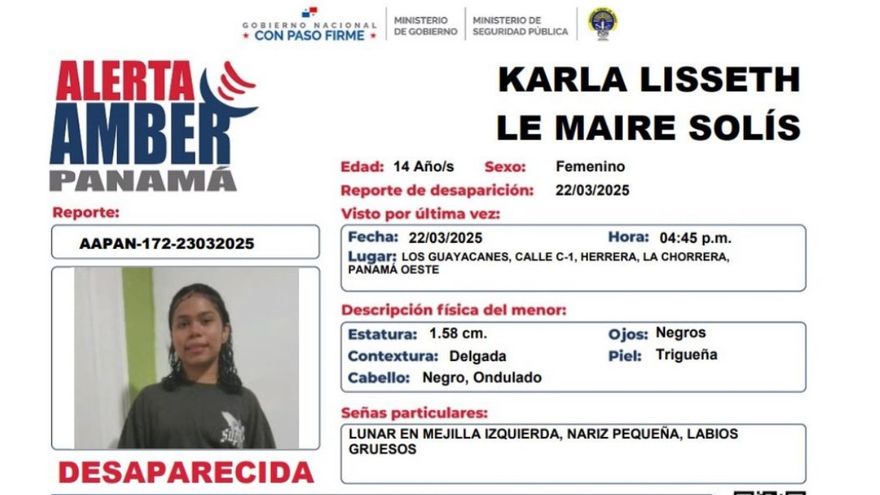 Se trata de Karla Lisseth Le Maire Solís, de 14 años, quien fue vista por última vez el 22 de marzo a las 4:45 p.m., en Los Guayacanes, Calle C-1, Herrera, en La Chorrera (Panamá Oeste).