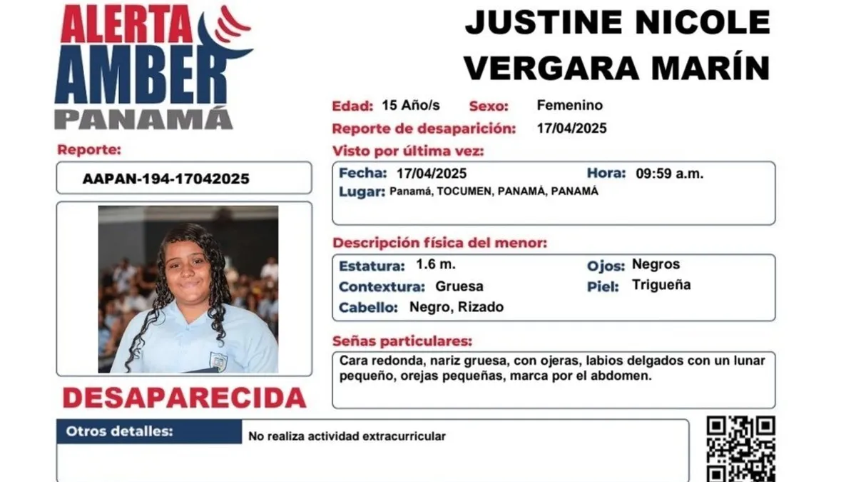 El Ministerio Público activó una Alerta Amber para dar con el paradero de Justine Nicole Vergara Marín, una adolescente de 15 años que fue reportada como desaparecida el miércoles 17 de abril de 2025, a las 9:59 a.m., en el área de Tocumen, Panamá.