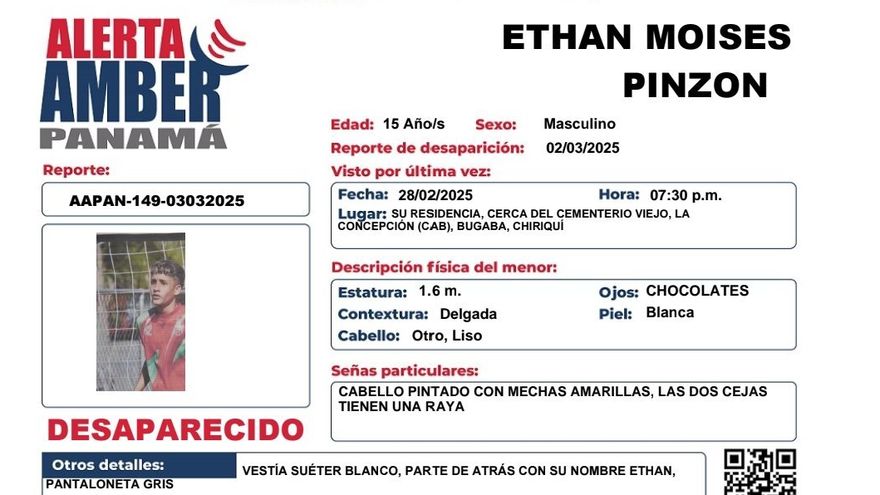 El Ministerio Público activó una nueva Alerta Amber en la mañana de este lunes 3 de marzo para localizar a Ethan Moisés Pinzón, un adolescente de 15 años desaparecido desde la noche del viernes 28 de febrero de 2025 en el distrito de Bugaba, provincia de Chiriquí.
