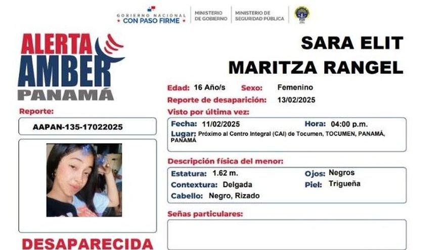 Ciudad de Panamá/El Ministerio de Gobierno y el Ministerio Público a través del sistema de alertas Amber,emitieron un nuevo aviso para localizar a Sara Elit Rangel, una adolescente de 16 años de edad, reportada como desaparecida desde el pasado 13 de febrero.