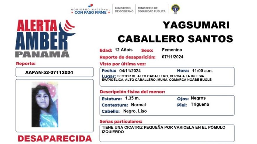 Ciudad de Panamá/Una nueva alerta Amber fue activada la mañana de este viernes 8 de noviembre, para dar con el paradero de la niña de 12 años de edad, Yagsumari Caballero Santos.