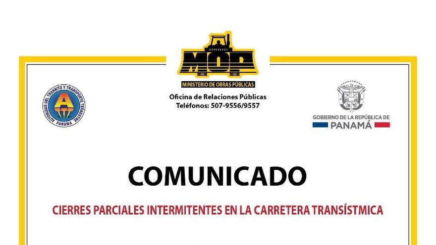 El Ministerio de Obras Públicas (MOP) informó que como parte de los trabajos en ejecución de la Rehabilitación y Reforzamiento del puente sobre el río Chagres, en la vía Transístmica, se estarán realizando cierres parciales.