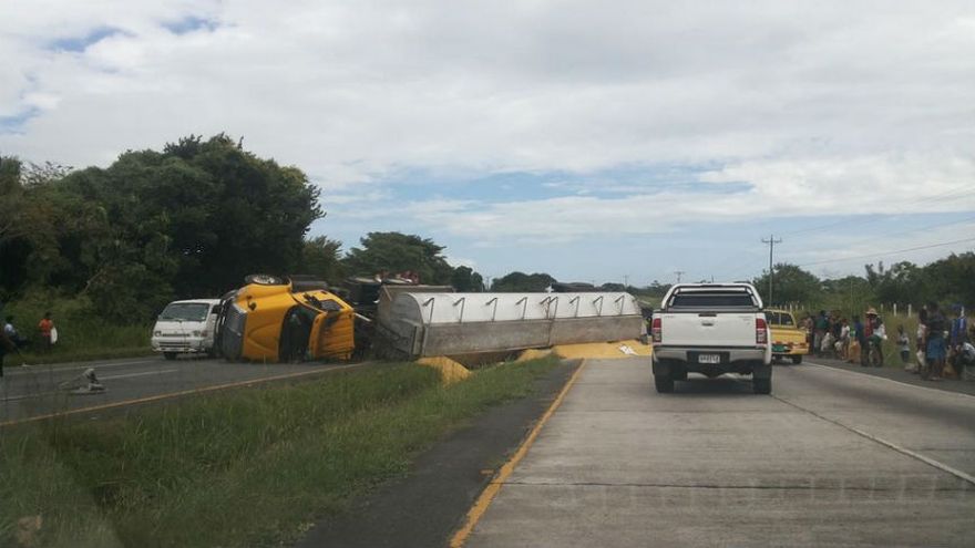 Un camión articulado, que transportaba alimentos para pollos, se volcó hoy martes 9 de diciembre de 2014tras colisionar con un auto más pequeño en Pueblo Nuevo, Antón, provincia de Coclé.