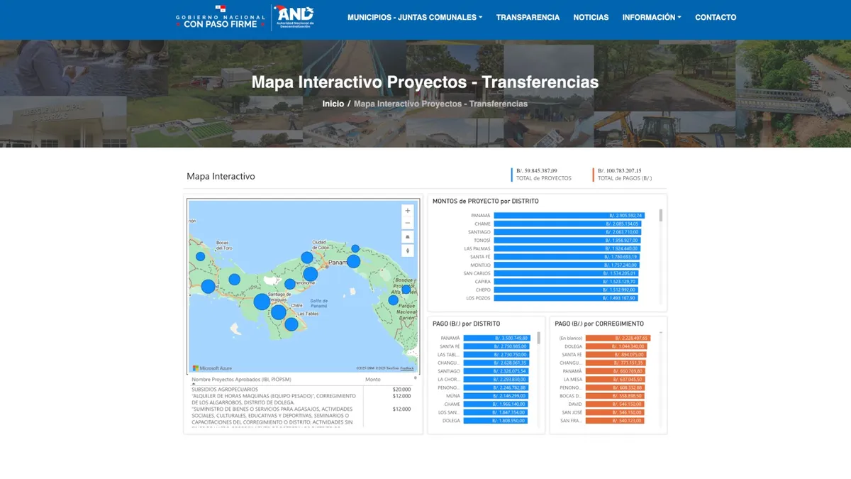 Panamá/Desde una obra de agua potable hasta la compra de equipos comunitarios, los proyectos financiados con fondos de descentralización ahora pueden ser consultados y ubicados en un mapa digital. La AND lanzó una herramienta que transparenta la ejecución de miles de iniciativas en municipios y juntas comunales del país.