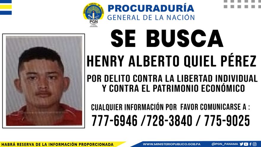 Ciudad de Panamá/El Ministerio Público, en conjunto con la Policía Nacional, informaron a la población que se encuentran en la búsqueda de Henry Alberto Quiel Pérez por su presunta vinculación en la desaparición de un profesor en Chiriquí.