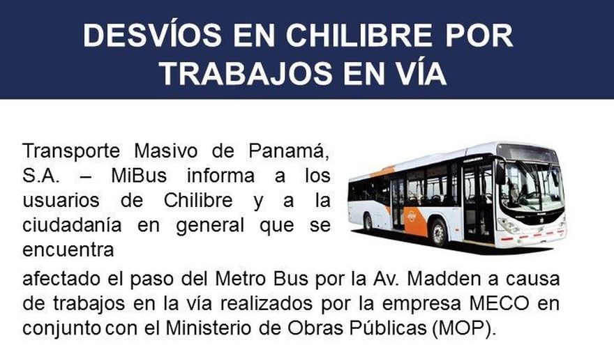 La empresa Mi Bus anunció afectaciones al paso del Metro Bus por la Avenida Madden, en Chilibre, a causa de trabajos de construcción iniciados por la empresa Meco y el Ministerio de Obras Públicas el día de hoy miércoles 15 de febrero.