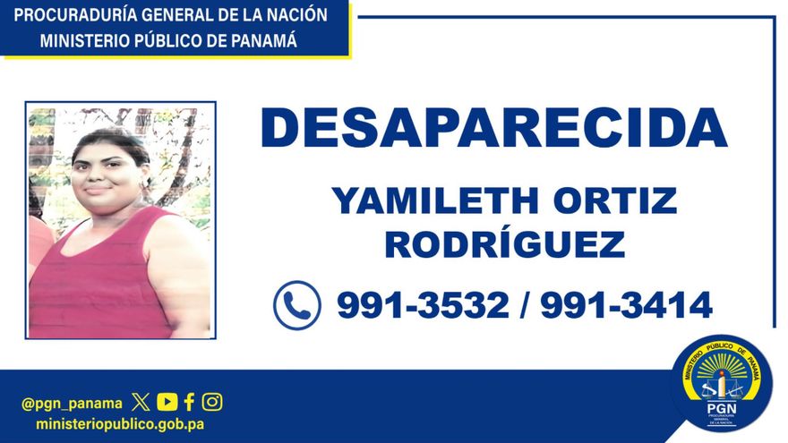 El Ministerio Público solicita la colaboración ciudadana para dar con el paradero de Yamileth Ortiz Rodríguez. Cualquier información puede ser comunicada de manera confidencial a los teléfonos de la Sección de Atención Primaria de Coclé: 991-3514 / 991-3532 o directamente a sus familiares a los números 6442-8170 / 6422-0177.