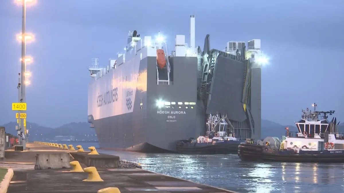 El portavehículos Hoegh Aurora pasa por el canal de Panamá. / TVN Noticias