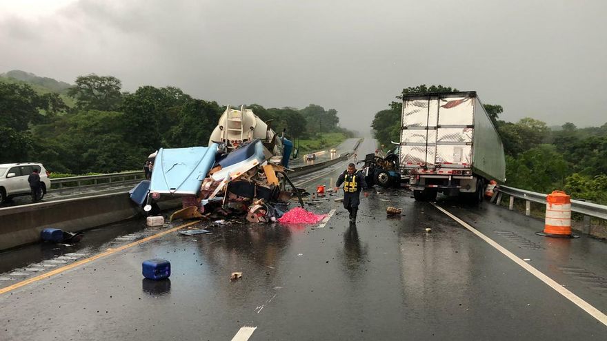 Un camión articulado colisionó contra otro camión que transportaba concreto en medio de una carretera que estaba mojada, producto de las fuertes lluvias que se registran en la zona.