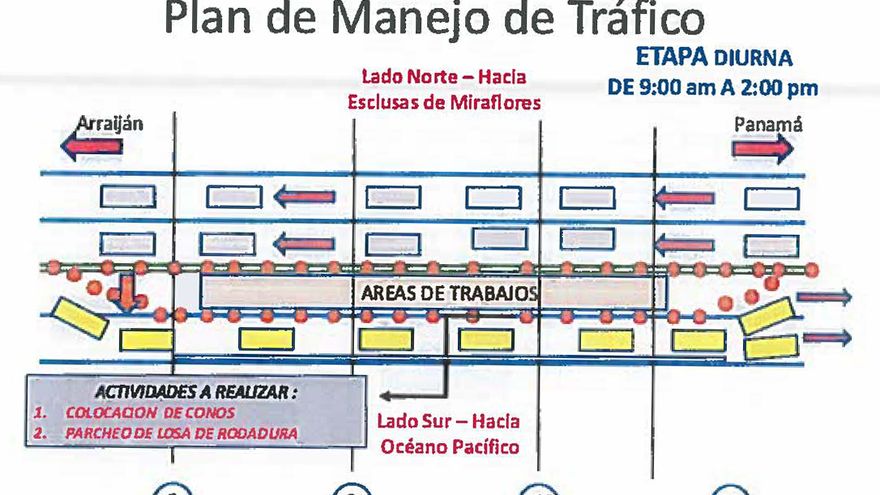 El MOP precisó que se cerrará un carril del lado sur, desviando el tránsito vehicular en dos direcciones desde Arraiján hacia Panamá y viceversa, por lo que se mantendrán operativos dos carriles del lado norte y uno del lado sur.