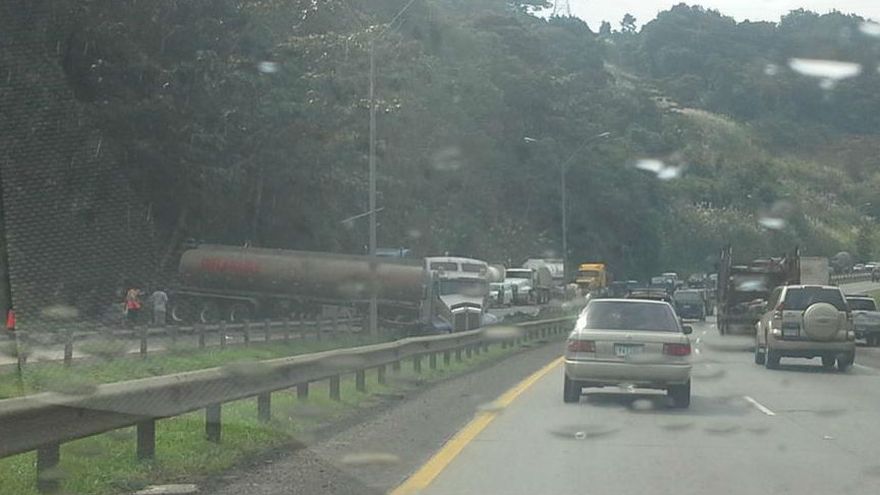 Un vehículo articulado de transporte de combustible se accidentó este viernes al mediodía en la vía Centenario, en dirección a la ciudad capital.