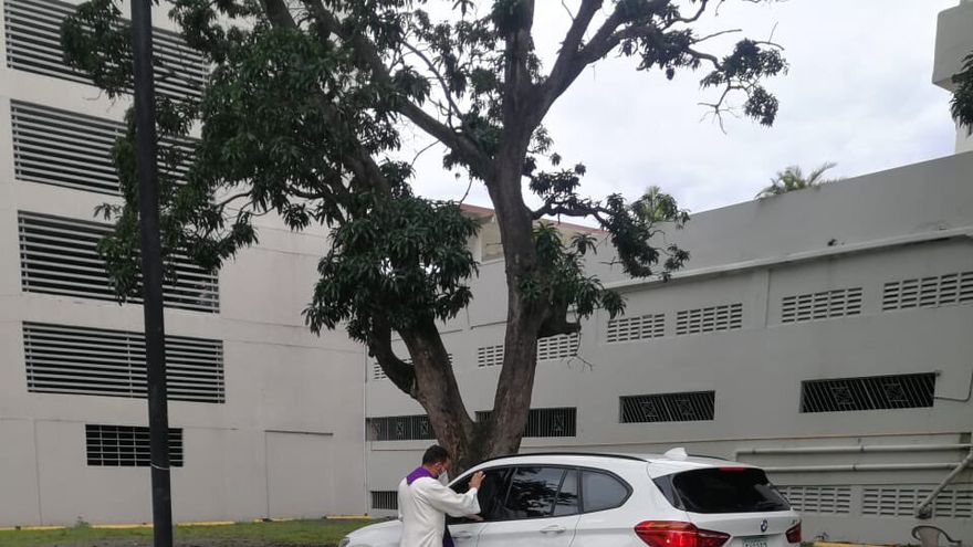 El sacerdote espera en el estacionamiento, dónde recibe a una persona que se confiesa desde su vehículo. Tanto el sacerdote como el creyente utilizan mascarilla (y visor en caso del sacerdote).