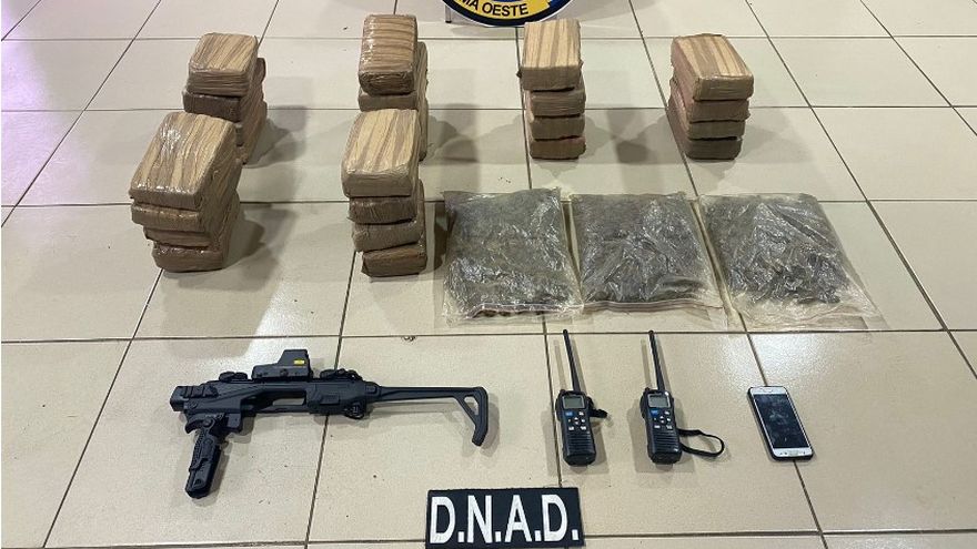 Además, se decomisaron dos radios portátiles, una carcasa para pistola, un celular y los 24 paquetes rectangulares que se presume sea droga.
