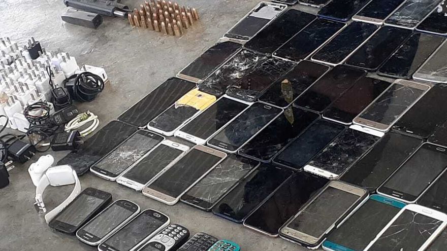 Entre los objetos decomisados están un arma de fuego, 87 municiones 9mm, 92 celulares, 157 platinas, “chips” de celulares, cables USB, “router”, gas irritante y envoltorios con materia vegetal que se presume sea droga.