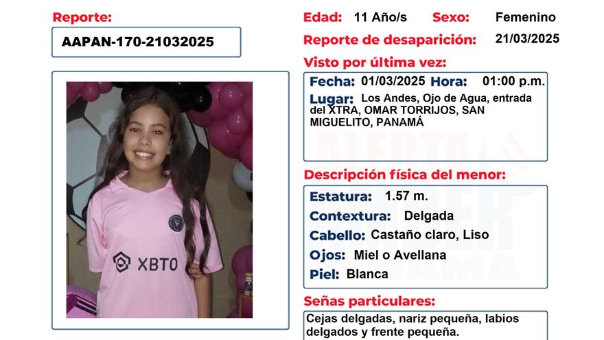 La niña tiene reporte de desaparición del viernes 21 de marzo, pero fue vista por última vez el 1 de marzo, a la 1:00 p.m. en Los Andes, Ojo de Agua.
