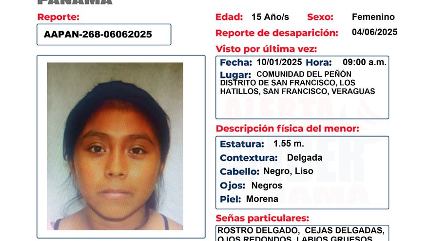 Se trata de Brittany Nicole Rodríguez, de 15 años, quien fue vista por última vez el 10 de enero a las 9:00 a.m. en la comunidad del Peñón en el distrito de San Francisco ubicado en el área de Los Hatillos, San Francisco, Veraguas. Se pudo conocer que su reporte de desaparición se presentó el 4 de junio del presente año.
