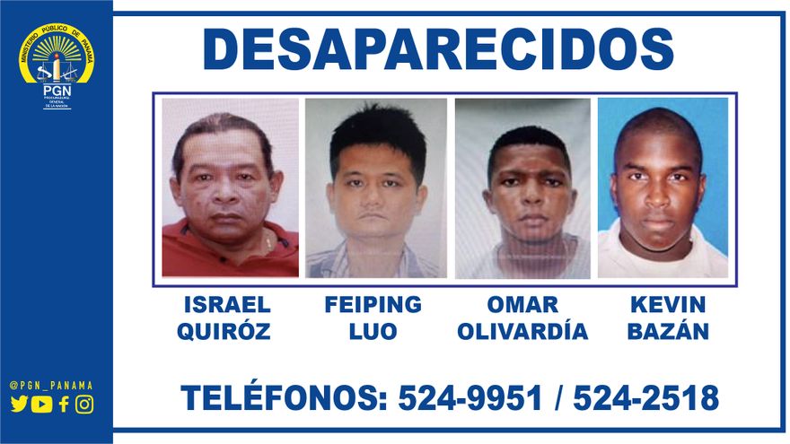 La Sección de Homicidio y Femicidio se encuentra en el desarrollo de una investigación por el delito contra la vida y la integridad personal, en perjuicio de cuatro personas desaparecidas quienes responden a los nombres de Feiping Luo, con cédula de identidad personal E-8-77860, Israel Quiroz con cédula 3-98-794, Omar Olivardia con cédula 8-934-1206 y Kevin Bazán con cédula 8-881-935.
