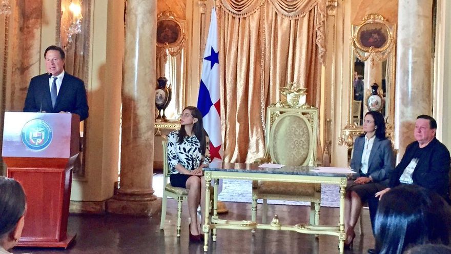 El presidente Juan Carlos Varela; la vicepresidenta y canciller Isabel Saint Malo, y la ministra de Gobierno, María Luisa Romero participaron en el acto. / Tomado de Twitter/Cancillería de Panamá