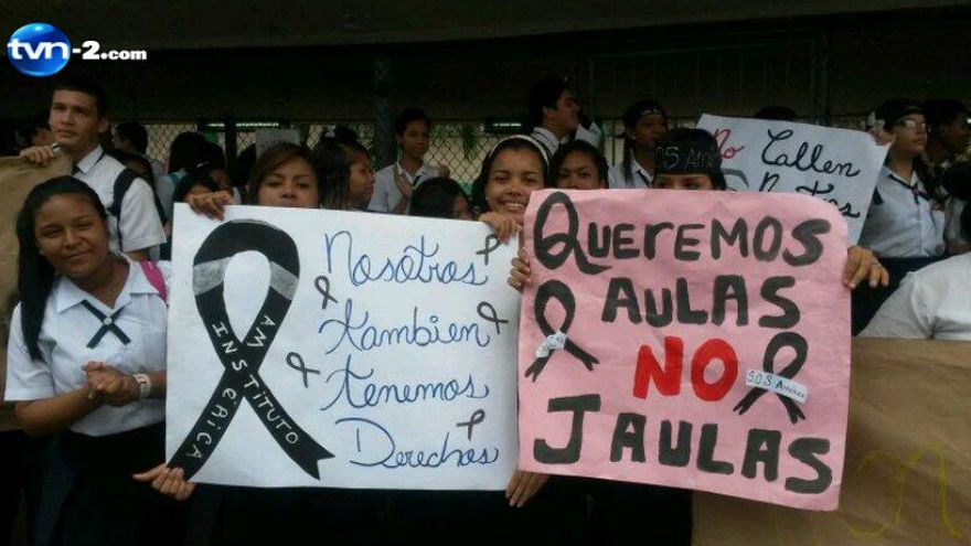 Estudiantes del Instituto América escenificaron este mediodía una protesta por el actual estado de su plantel.Los alumnos, apostados fuera de su colegio, a orillas de la calle principal del sector de Santa María, corregimiento de Bethania, gritaban consignas y exigían a las autoridades del Ministerio de Educación (Meduca), mejores condiciones en sus aulas de clases.Actualmente, los estudiantes dan clases en los pasillos. "No queremos dar clases en jaulas, como delincuentes", dijeron los estudiantes a TVN Noticias, en referencia a que las aulas en donde reciben sus clases están hechas con carriolas, asemejándose a jaulas.El Instituto América inició su año escolar con polémicas luego de los retrasos en su remodelación. Los padres de familia y educadores evitaron que los alumnos fueran trasladados a otros colegios, logrando que el gimnasio y algunos pasillos fueran habilitados como salones, pero a meses de haberse iniciado el periodo escolar, siguen allí.
