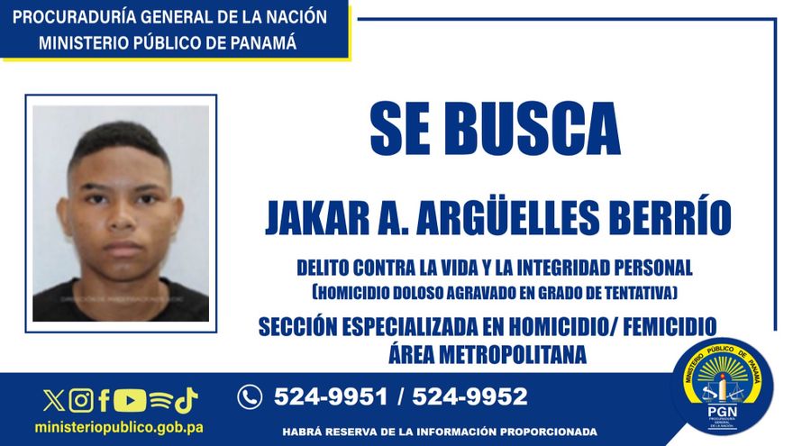 Ciudad de Panamá/La Sección Especializada en Homicidios y Femicidios de la Fiscalía Superior Metropolitana de la Procuraduría General de la Nación ha emitido un llamado urgente a la ciudadanía para colaborar en la localización de Jakar Andrés Argüelles Berrío, quien se encuentra requerido por las autoridades mediante orden de aprehensión.