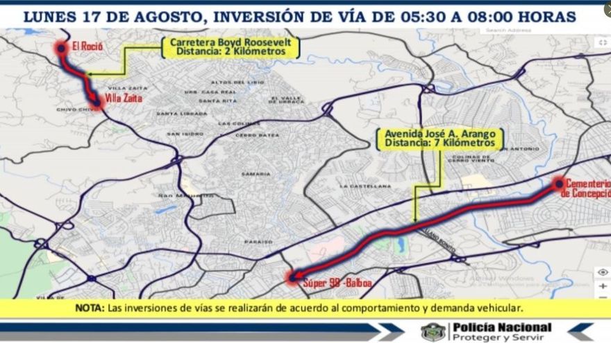 Desde las 5:30 a.m., del próximo lunes 17 de agosto hasta las 8:00 a.m., la Autoridad de Tránsito y Transporte Terrestre (ATTT) y la Dirección Nacional de Operaciones de Tránsito (DNOT) de la Policía Nacional, desarrollarán un operativo de inversión de carriles, en Arraiján y en las Avenidas José Agustín Arango y Boyd Roosevelt.