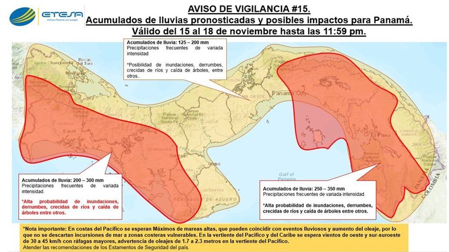 El Sistema Nacional de Protección Civil (Sinaproc) elevó alerta amarilla en las provincias de Darién, Panamá, Colón, Los Santos y las comarcas Guna Yala y Emberá Wounnan, como medida de prevención por los efectos colaterales de la tormenta tropical IOTA.