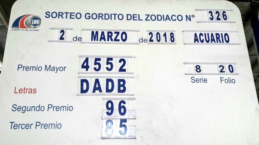 La Loteria Nacional de Beneficencia (LNB) confirmó que se vendió la fracción ganadora del Gordito del Zodiaco Millonario de numeración 4552, serie 8, folio 20, en la Agencia de San Felipe en la ciudad capital.
