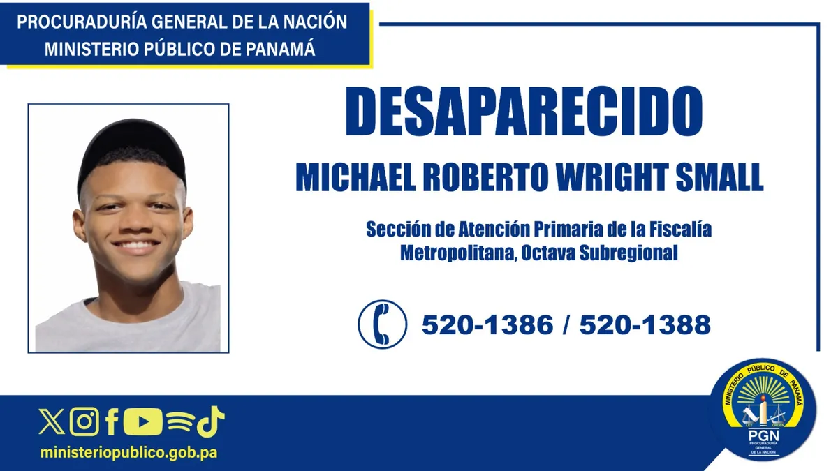 El Ministerio Público ha solicitado la ayuda ciudadana para dar con el paradero de Michael Roberto Wright Small, de 19 años de edad, quien desapareció en el corregimiento de Pacora, sector Cabra, distrito de Panamá. En ese sentido, la Fiscalía Metropolitana, Octava Subregional, adelanta una investigación penal por delito contra la libertad, en la modalidad de persona desaparecida, con el objetivo de esclarecer este caso.