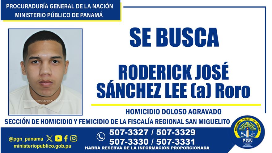 Roderick Josué Sánchez Lee, alias “Roro”, se ha convertido en uno de los más buscados del Ministerio Público, debido a una investigación que adelanta la Sección de Homicidio y Femicidio de la Fiscalía Regional de San Miguelito.