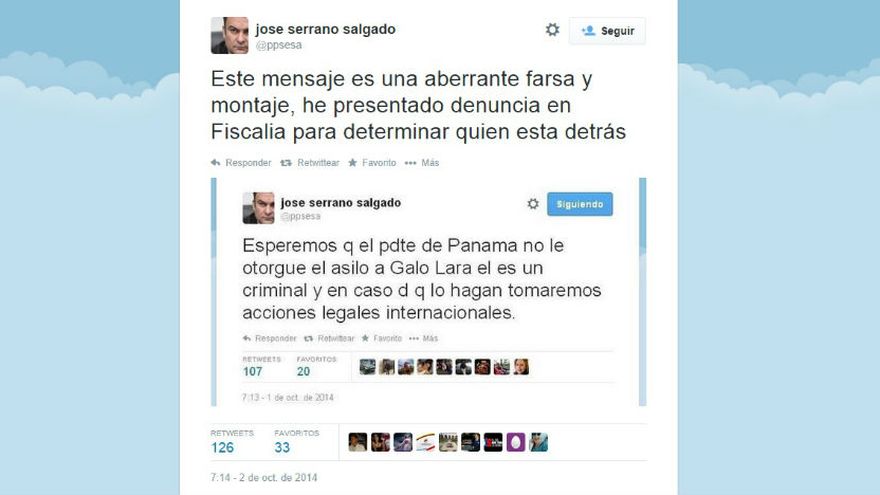 El funcionario desmintió a través de la misma red social que “este mensaje es una aberrante farsa y montaje, he presentado denuncia en Fiscalía para determinar quién está detrás”. La aclaración de Serrano se difundió a través del medio EcuadorInmediato.com y dado a conocer en Panamá por la embajada de ese país.