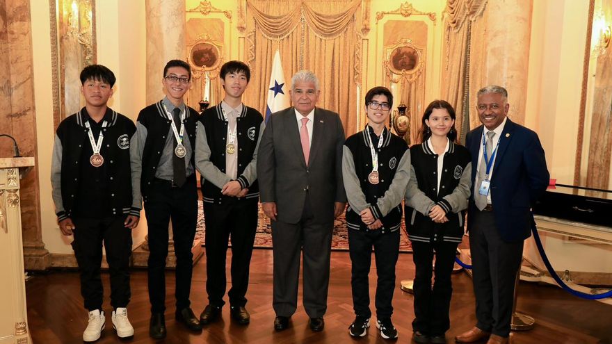 Acompañados del secretario nacional de Ciencia, Tecnología e Innovación (Senacyt), Eduardo Ortega Barría, los jóvenes Goten Loaiza, Ulises Peña, Toni Zhu, Jahir Zurdo y Valentina Rincón fueron elogiados por el mandatario por su destacable participación en el evento científico y tecnológico, en donde, además del oro, obtuvieron las preseas de plata, bronce y una mención honorífica.