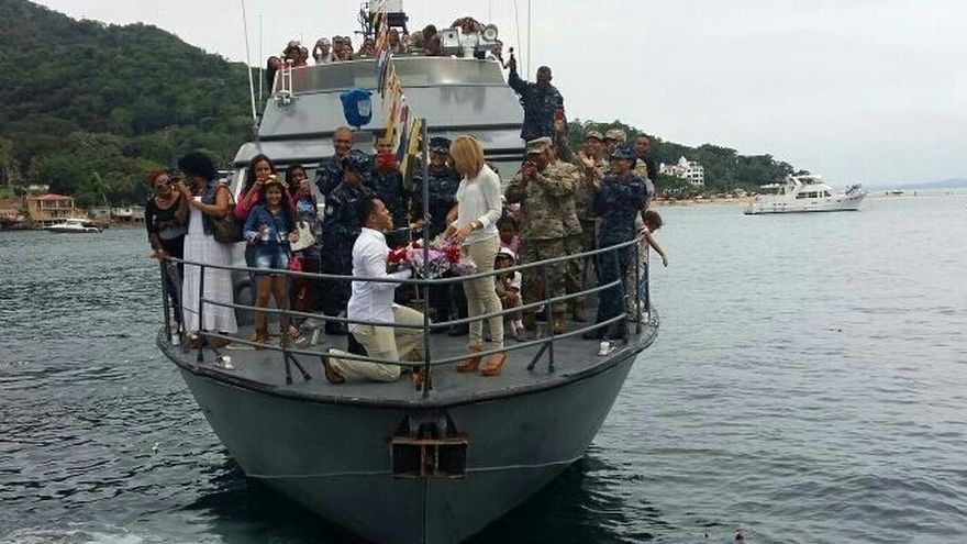 El teniente Miguel De León, quien labora en la Unidad de Botes Especiales del Senan, se arrodilló frente a su novia con quien mantiene una relación desde 3 tres años, para pedirle que se convirtiera en su esposa.