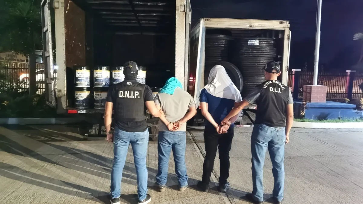 Durante las diligencias, además de la aprehensión de los dos sospechosos, se logró recuperar una importante cantidad de mercancía presuntamente vinculada al hecho investigado. Entre los bienes incautados figuran más de 60 neumáticos, más de 30 tanques de aceite y varios galones adicionales de aceite automotriz.
