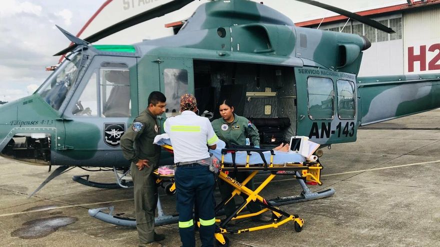 El helicóptero se traslada hasta el sector de Nicanor, donde aterriza y el herido es montado en otra aeronave que lo traslada hasta la ciudad de Panamá; donde es llevado al Hospital Santo Tomás para recibir atención médica especializada.