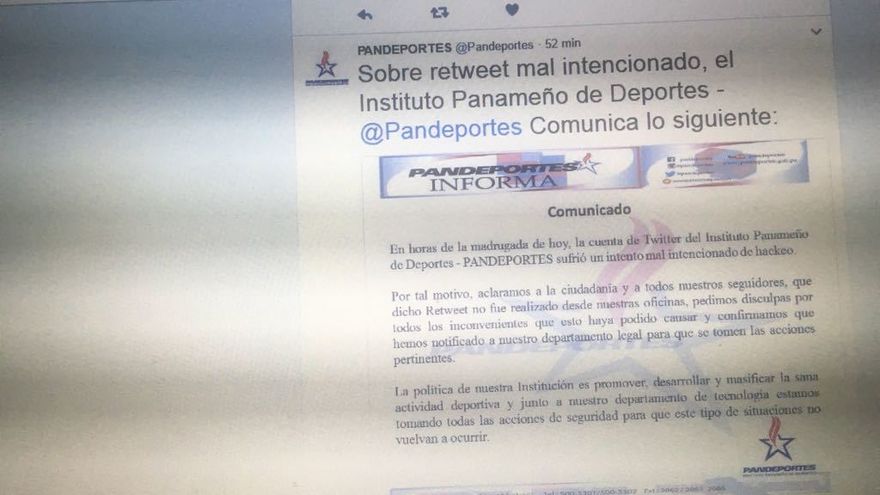 El retweet, agregó, “no fue realizado desde nuestras oficinas”. Pandeportes anunció que comisionará a sus abogados para que investiguen.