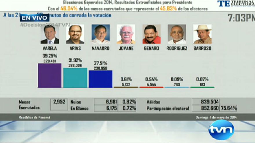 Con el 46.04% de mesas escrutadas a las 7:03 p.m., el candidato de “El Pueblo Primero”, Juan Carlos Varela, encabeza la preferencia electoral con el 39.25% de los votos, seguido por José Domingo Arias con 31.92% y Navarro con 27.51%.