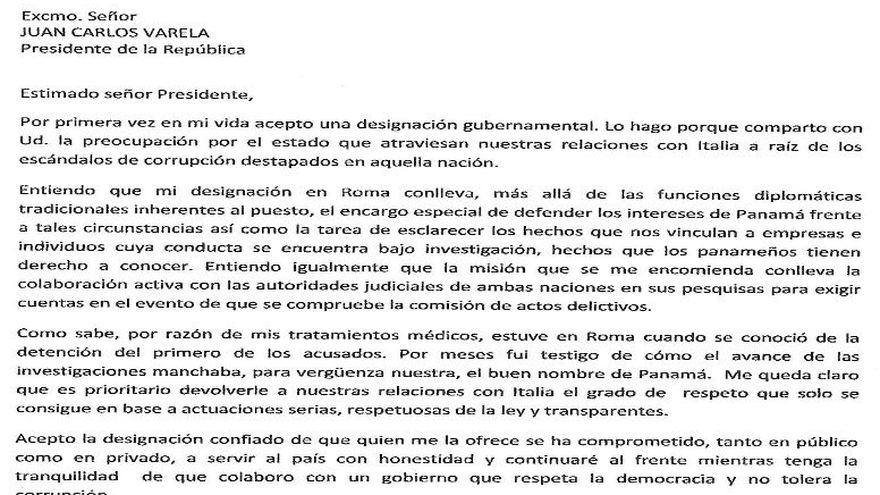 En una carta dirigida al presidente de la República, Juan Carlos Varela, Fernando Berguido, designado embajador de Panamá en Italia, acepta y asume las tareas de esclarecer los hechos que vinculan Panamá en hechos que se ventilan en tribunales de aquel país.