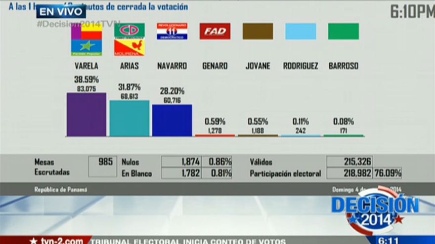 A las 6:10 p.m. de este domingo 4 de mayo de 2014, Juan Carlos Varela encabeza la tendencia de votos con 38. 59 por ciento.En segundo José Domingo Arias con 31.87 y en tercer lugar Juan Carlos Navarro con 28.20. Total de mesas escrutadas 985.