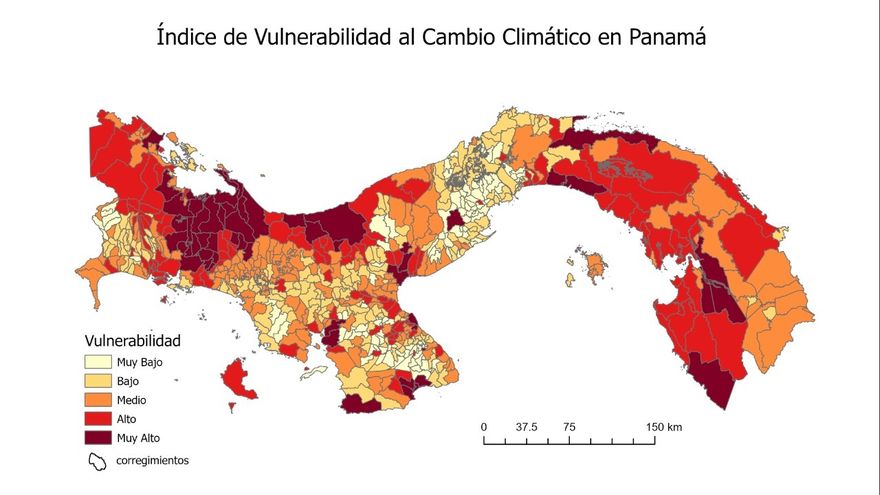 Por otro lado, el área de Guna Yala, corregimientos de Darién y la comarca Emberá aparecen identificados en el mapa con valores altos de vulnerabilidad al igual que el área sur de Veraguas y Los Santos por sus indicadores de niveles socioeconómicos y capacidad adaptativa reducida.