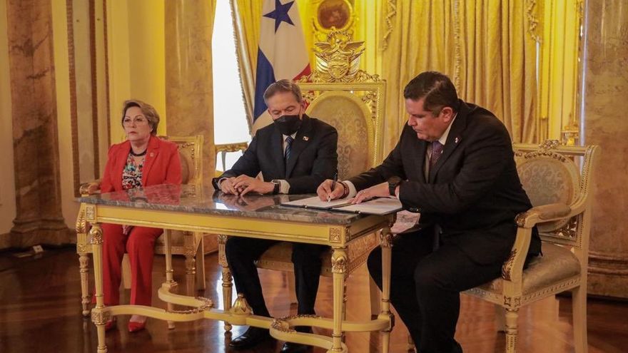 Durante el acto protocolar realizado en el Salón Amarillo de la Presidencia de la República, el ministro de Seguridad, Juan Manuel Pino, firmó la Ley que posteriormente fue sancionada por el mandatario Cortizo.