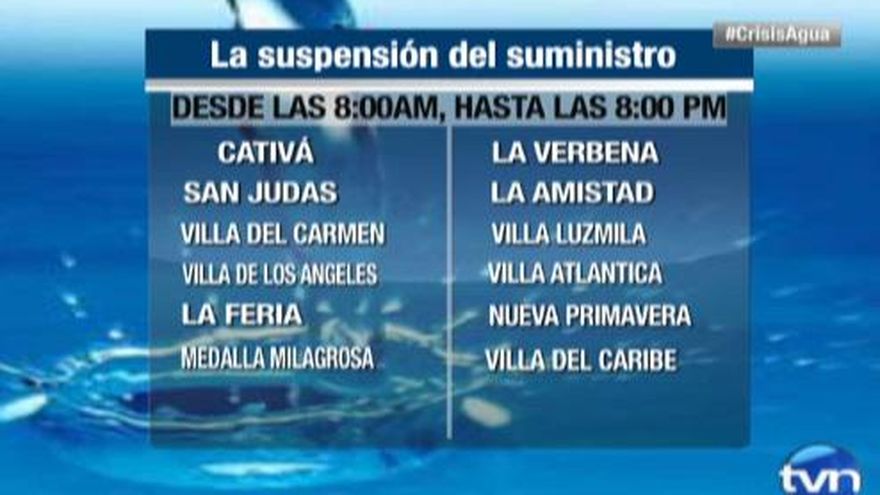 Los residentes de la provincia de Colón estarán sin agua a partir de las 8:00 a.m. de este viernes, 14 de agosto.