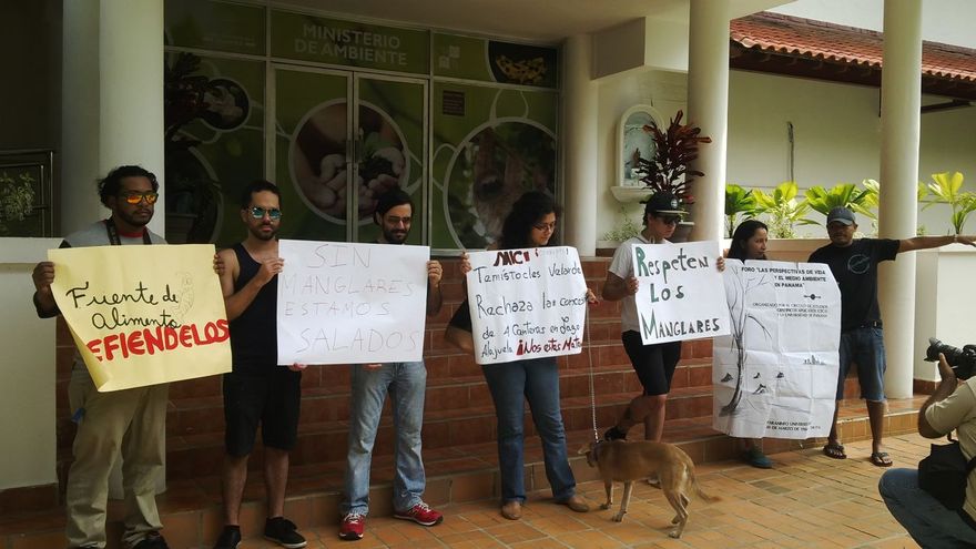Un grupo de jóvenes de la agrupación “El Kolectivo”, llegó esta mañana a las instalaciones del Ministerio de Ambiente (Miambiente), para realizar un piqueteo en acción de protesta por la destrucción de los manglares.