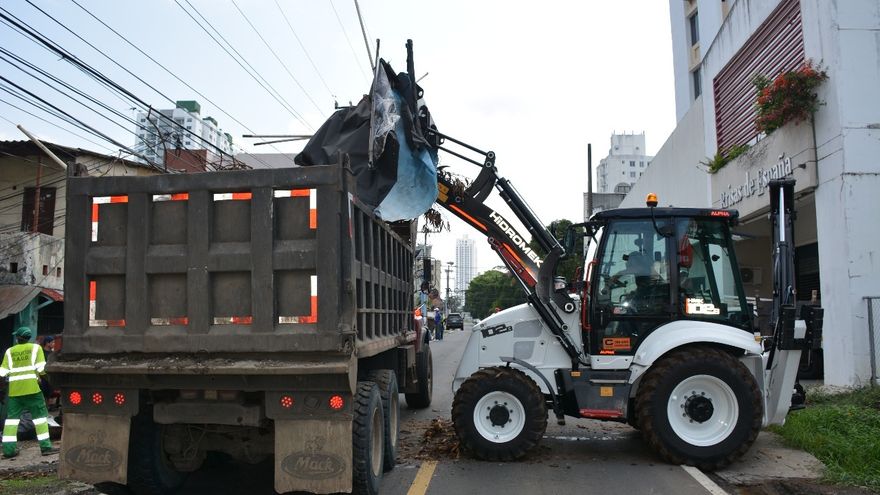 Tres retroexcavadoras, cuatro camiones volquete y tres camiones rejilla, fueron utilizadas este sábado 25 de abril en una jornada de limpieza en Carrasquilla, como parte de las acciones que se ejecutan para contrarrestar la propagación del COVID-19.