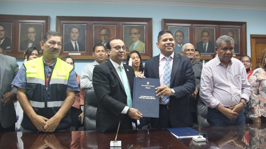 El rector Eduardo Flores y el secretario general del Sindicato Nacional de Trabajadores de la Universidad de Panamá (Aseupa -Sintup), Damián Espino, acordaron negociar la primera convención colectiva de la casa de estudios superiores.