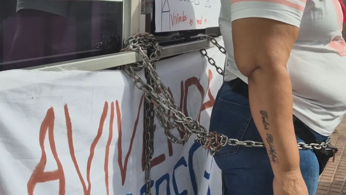 Los manifestantes, algunos de los cuales se encadenaron en la puerta principal del banco, exigen una solución definitiva a su situación habitacional.